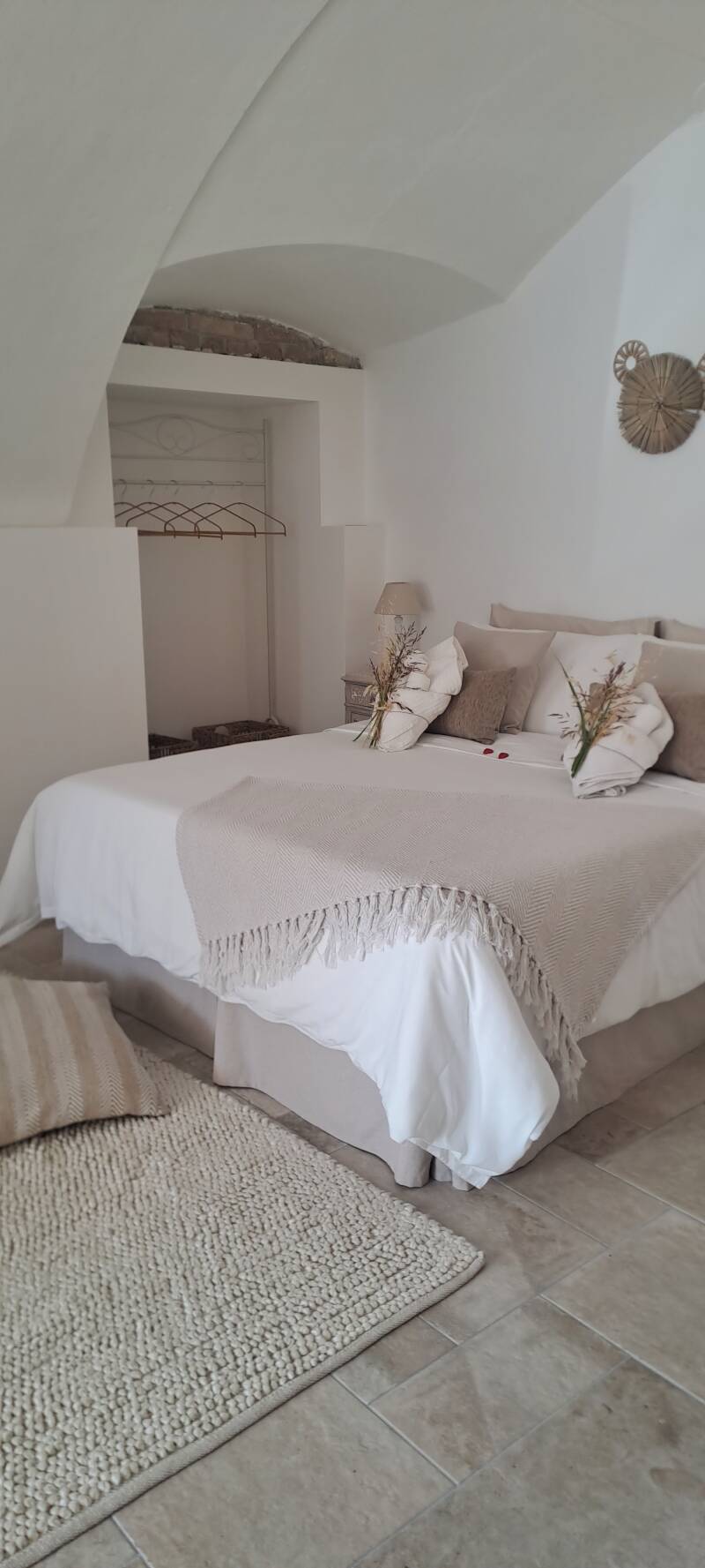 Avvolta da una luce morbida e naturale, la Camera Vinessa è un piccolo rifugio di quiete e armonia. I toni caldi del beige e del bianco, insieme ai tessuti leggeri in stile lino, donano all’ambiente un’eleganza semplice e naturale, tipica della campagna gardesana.
